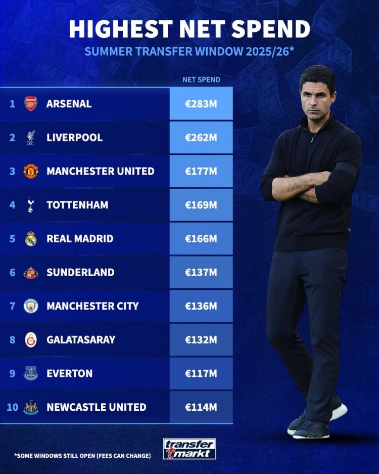 9月2日讯 主流联赛的夏季转会窗已经关闭,《转会市场》也统计了今夏净支出情况,阿森纳领衔英超8队但切尔西并不在列。
